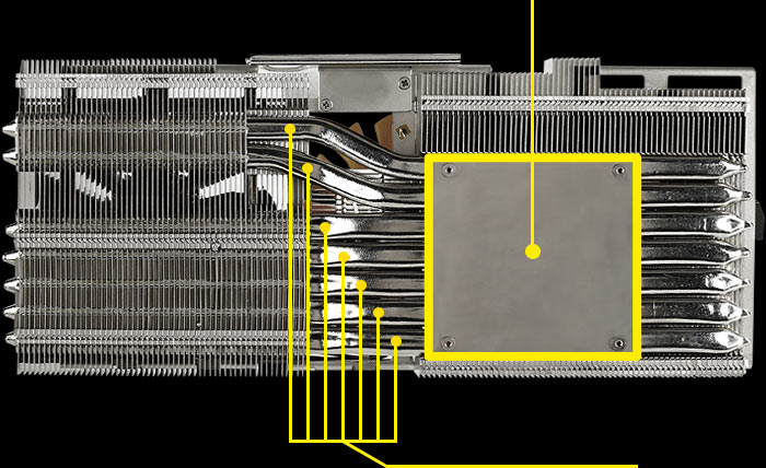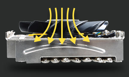 The aluminium fin grid array of the thermal design features special grooves that prevent thermodynamic "dead air" situations. This maximizes the use of airflow and efficiency of the available cooling surface and enhances heat pipe performance because of the directed airflow.